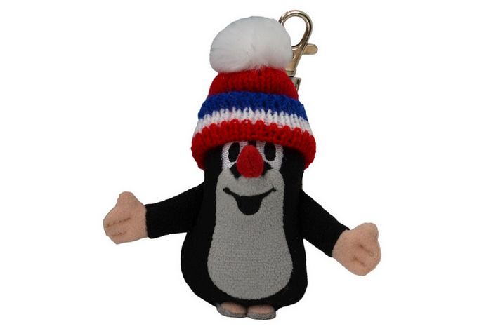 Plyšový přívěsek na kovové karabině. Krteček s kulichem v barvě trikolóry červené.