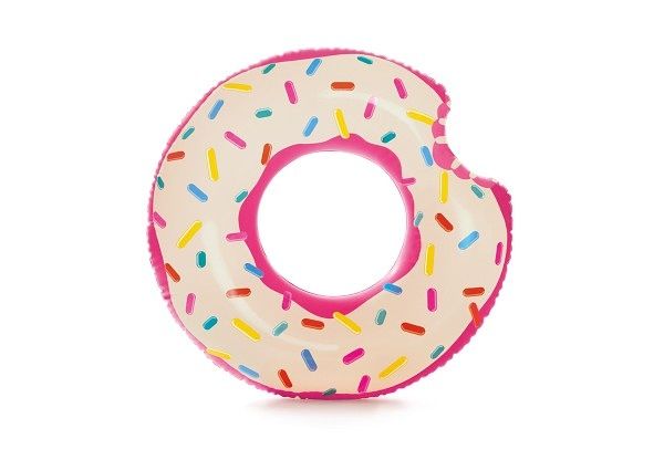 Nafukovací kruh donut o velikosti 1,07 m x 99 cm. Opravná záplata přiložena. Vyrobeno z kvalitního vinylu. Nafukovací kruh s realistickým potiskem nakousnuté koblihy Donutu. Kruh využijete v bazénu i na dovolené u moře. Krásný kousek, se kterým bude koupání jedna velká zábava. Součástí balení je také sada na opravu.