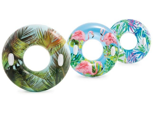 INTEX 58263 Nafukovací kruh 97 cm je vhodný pro děti od 9 let. Krásný kruh v tropických barvách je vyroben z vysoce kvalitního vinylu, čímž zajišťuje vysokou odolnost při všech vodních radovánkách. Tento nafukovací kruh je skvělým společníkem na lenošení u moře, bazénu nebo rybníku a zažijete s ním spoustu zábavy. Parametry:Rozměr: 97 cm2 držadlaMaximální zatížení: 80 kgMateriál: vinyl 0,25 cmVhodné pro děti od 9 let. Hmotnost: 0,59 kg
