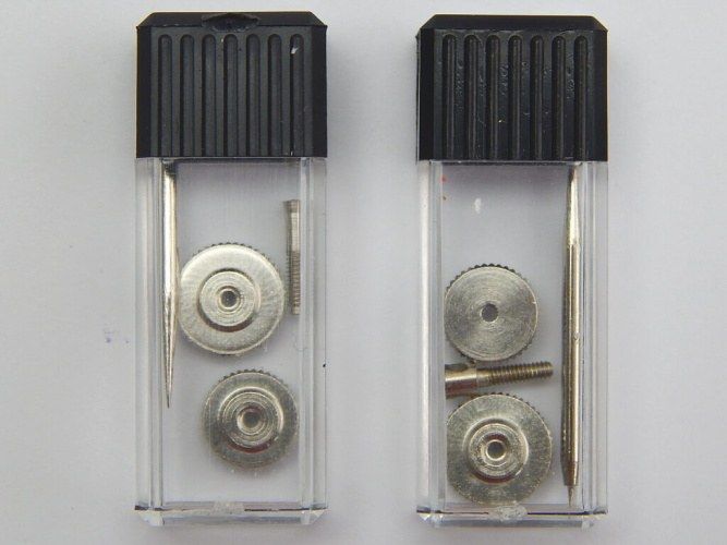 Kružidla dílce 07622. Náhradní díly do kružidel technické řady 700, v plastové tužence jsou narovnány 2 ks rýhované matice, 1 ks kotevního kuželového šroubu, 1 ks držáku jehly, 1 ks jehly s osazením. Zablistrováno 10 ks tuženky s náhradními díly v jednom oddělení tvarové vložky, celkem 3 oddělení, tj. celkem 30 tuženek v jednom balení - blistru