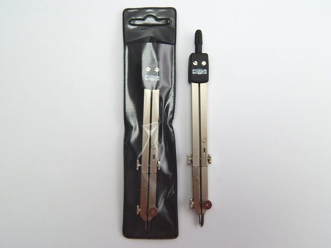 Kružidlo kovové 06542. Kružidlo kovové s teleskopemK666 je určené pro střední školy na rýsování kružnic o průměru v rozsahu 5-450 mm. Vysunutím teleskopu se zvětší průměr kružnice. Tužec a jehlovou nožku lze náklápět a zvyšit tak komfort rýsovaní. Kovové díly jsou z niklované mosazi, šroubky z oceli a závěška plastová černá. Ke kružidlu lze dokoupit nástavec a rýsovat tak kružnice technickými pery nebo automatickou mikrotužkou. Kružidlo je zabaleno do plastového obalu s transparentní vrchní částí a eurozávěsem.