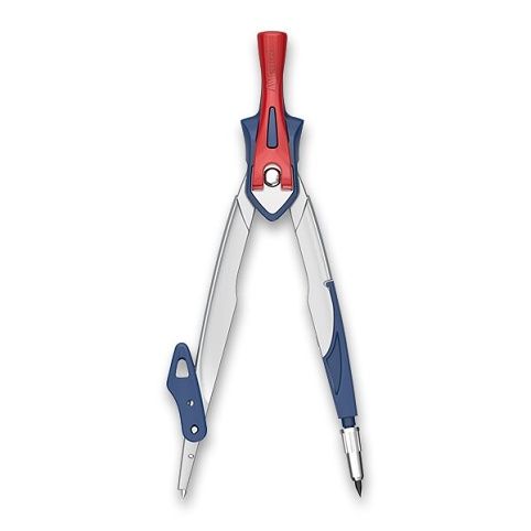 Kružítko Maped- stop systém. Pevné zajištění ramen v dané poloze. Ochranný posuvný kryt na rameni kružítka zabrání poranění a nechtěnému zlomení tuhy. Opsanou tuhu lze vyměnit.
