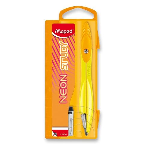Kovové kružítko Maped Study Neon s rameny má ergonomický úchop. Souprava obsahuje kružítko a balení s tuhou.