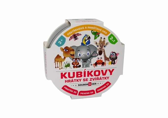 Zábavná karetní postřehová a paměťová hra balená v malé plechové krabičce. To jsou Kubíkovy hrátky se zvířátky, které obsahují tři zábavné karetní hry: Hmaťáka, Domino a Pexeso. Děti si zábavnou formou zlepšují postřeh, paměť a také se mohou přiučit angličtině. Jednoduchá pravidla a stále usměvavá zvířátka. 57 druhů zvířátek, hra pro 2 a více hráčů.