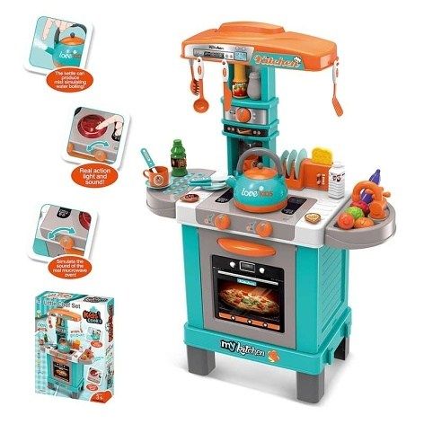 Kuchyň se světlem a zvukem. Spousta kuchyňského vybavení, otočné