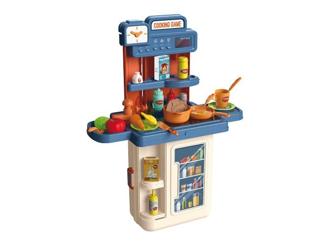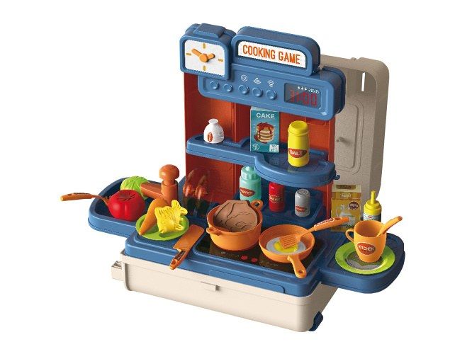 Kuchyň set stolek v kufříku na kolečkách, s vysunovací rukojetí. Rozměry složeného stolku 49 x 24 x 63 cm. Balení obsahuje 41 ks nástrojů a příslušenství. Vařič se zvukovými a světelnými efekty, vypouští páru (čtvercový otvor ve vařiči se naplňuje vodou). Tekoucí voda ve dřezu.