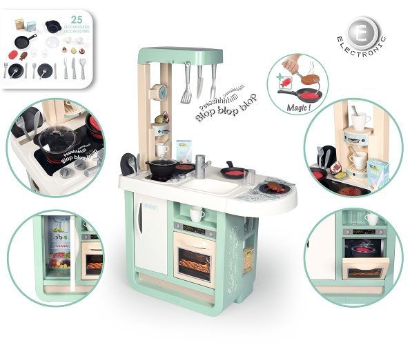 Kuchyňka Bon Appetit Cherry v bastelovém barevném provedení. Prodloužená pracovní deska, kávovar na kapsle, elektronická plotýnka se zvukem vaření, lednice, trouba, nádobí a makety potravin. Maso a ryba s efektem syrového a upečeného masa (každá strana jinak barevná). Obsahuje 25 ks příslušenství. Rozměry: 66,5 x 32 x 95,7 cm. Výška pracovní desky 48,5 cm. Hmotnost: 3,41 kg.