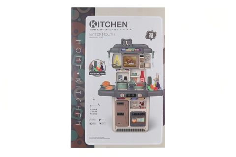 Velká kuchyňka s doplňky na baterie. Materiál plast. Napájení na 3 AA baterie (nejsou součástí balení). Kuchyňka po vložení baterií svítí a vařič vydává zvuky vaření. Balení obsahuje celkem 35 dílků. Rozměry složené kuchyňky 69x45x22 cm. Věk 3+