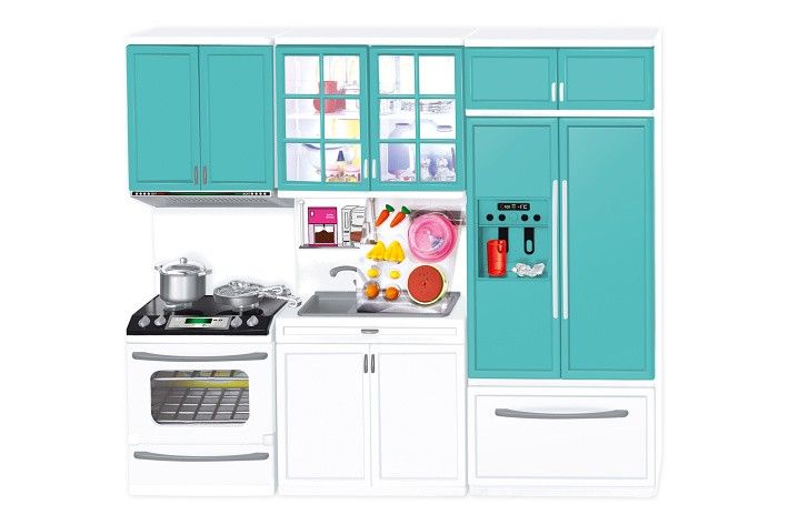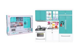 Kuchyňka. Rozměry 38x8x32cm. Obsahuje vařič s troubou, chladničku a dřez. Vařič a trouba vydává světelné a zvukové efekty. Efekty se zapínají spínačem na vařiči. 2xAAA baterie součástí.