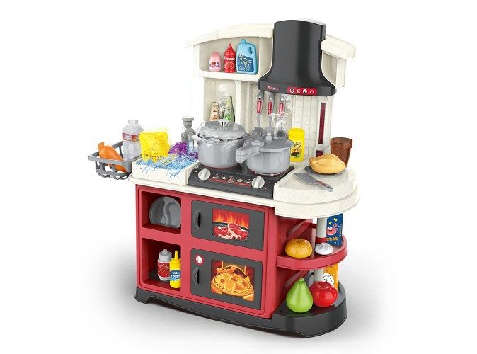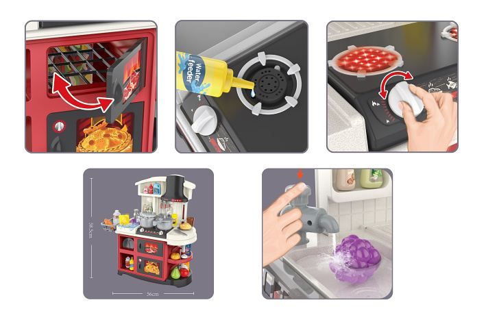 Kuchyňka. Rozměry 56 x 25,5 x 58,5 cm. Funkce - otočením knoflíku na sporáku světelné a zvukové efekty plotýnky, tekoucí voda. 3xAA baterie nejsou součástí.