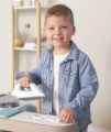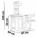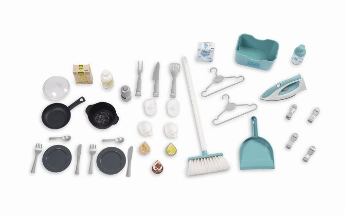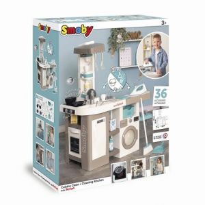 V kuchyni Smoby Tefal Studio s prádelnou lze vařit, prát i žehlit, protože inovativní kuchyně 2 v 1 má nejen dokonalé kuchyňské vybavení, ale také skutečnou prádelnu. Má špičkovou výbavu: elektronickou varnou desku se dvěma různými zvuky vaření, dřez s kohoutkem, troubu, lednici, digestoř s integrovaným kávovarem na espresso a sodovku. Pračka je vybavena otevíratelnými dvířky a přihrádkou na prací prostředek rozdělenou na dvě části. Lze jej ovládat pomocí tlačítka s funkcí krick-crack. K dispozici je také sušák na prádlo, žehlicí prkno s mechanickou žehličkou a malý koš na prádlo se dvěma držadly, který lze uložit pod žehlicí prkno. Rozsáhlá řada kuchyňských a domácích doplňků zahrnuje celkem 36 doplňků: pánev, rendlík s poklicí, tři kuchyňské náčiní, dva šálky, dvě sklenice, dva talíře, dvě sady příborů, tři kapsle do kávovaru, sůl a pepřenky s funkcí crick-crack a maketami obalů potravin. Nechybí smeták a lopatka, dvě ramínka, čtyři kolíčky na prádlo a žehlička s mechanickou funkcí. Rozměry (DxŠxV): 87 x 64 x 100 cm..