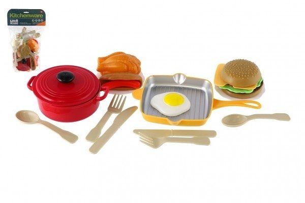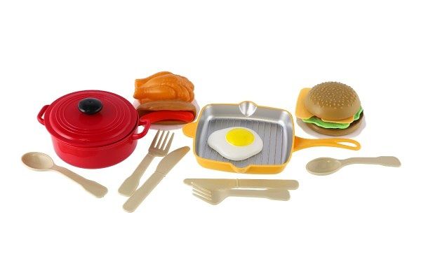 Set kuchyňského nádobí, náčiní a jídla je připraveno pro malé kuchařky a kuchtíky, kteří chtějí ve své kuchyňce připravovat pokrmy.