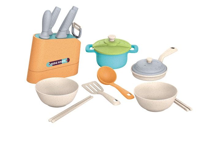 Kuchyňské nádobí Organic. Hrnec s poklicí, pánvička s poklicí, 2 misky, 3 nože, zásobník na nože, brousítko nožů, škrabka, 2 naběračky, 2 hůlky.