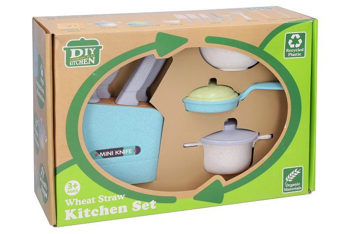 Kuchyňské nádobí Organic. Hrnec s poklicí, pánvička s poklicí, 2 misky, 3 nože, zásobník na nože, brousítko nožů, škrabka, 2 naběračky, 2 hůlky.