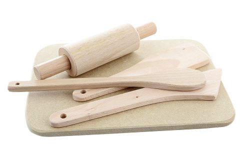 Sada dřevěných pomůcek do kuchyně. Balení obsahuje prkénko, váleček, vařečku a 2 obracečky. Baleno v sáčku. Rozměry prkénka cca 25x18x0,8 cm. Rozměry válečku cca 19x4 cm. Výrobek je hračka. Věk 3+