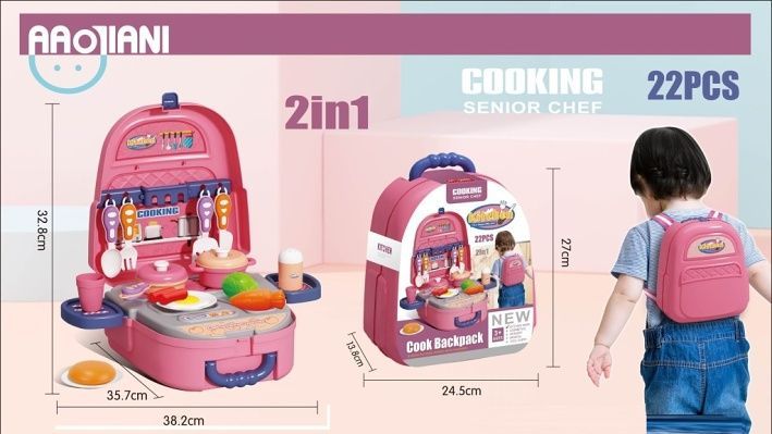 Kuchyňský set v praktickém balení, lehce sbalíš a dáš na záda jako batůžek. Set obsahuje 22 kusů kuchyňského příslušenství: příbory, hrnce, pokličky, imitace jídla a další příslušenství. Podporuje koordinovaný vývoj těla a mozku, pomáhá dítěti naučit se koordinovat oči, ruce a mozek při hraní.