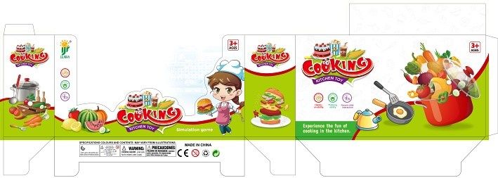 Kuchyňský set. Rozměry 27,5x25,5x7,5 cm. Součástí odkapávač, nádobí, sporák, zelenina (ovoce).