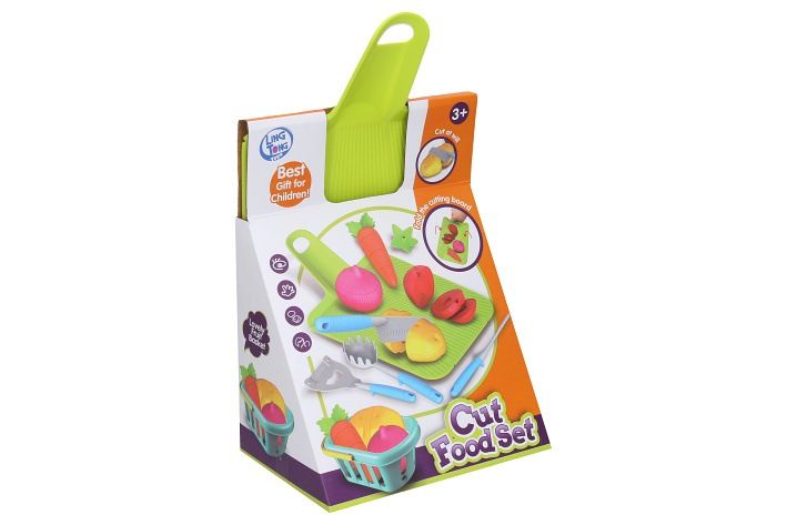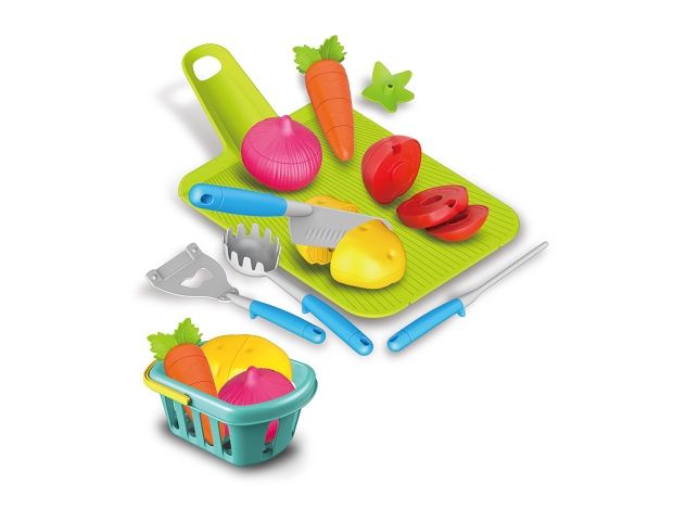 Kuchyňský set na krájení. Krájecí prkénko, košík, rozkrojitelná mrkev, rajče, brambora, cibule, nůž, škrabka, napichovátko, naběračka.