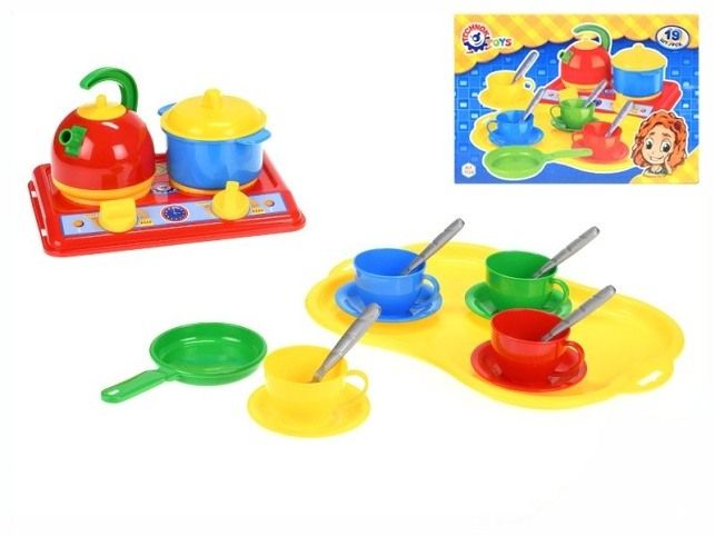Plastový červený kuchyňský sporák s nádobím a podnosem k servírování.