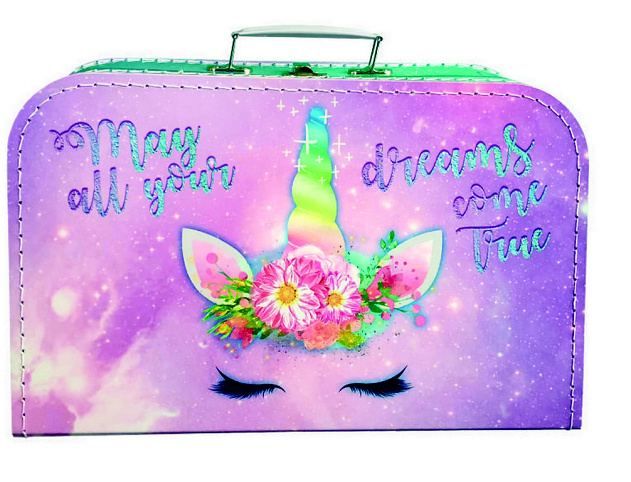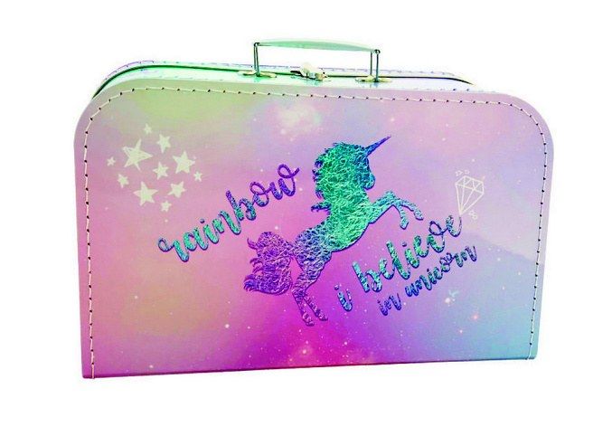 Lepenkový kufřík s motivem úžasného Jednorožce ti přece nesmí chybět! Tento praktický kufřík o rozměrech 35 x 23 cm může sloužit nejen na hraní, ale i na cestování. Paráda!