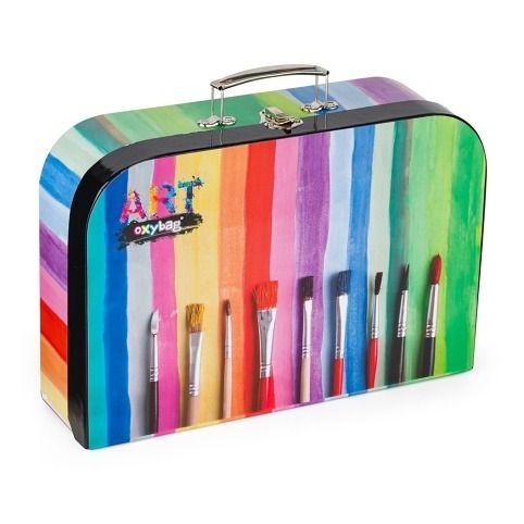 Lamino kufřík na výtvarnou výchovu. Do kufříku se vejde formát A4. Materiál: papír, lepenka, kovový zámeček, kovové nýty.