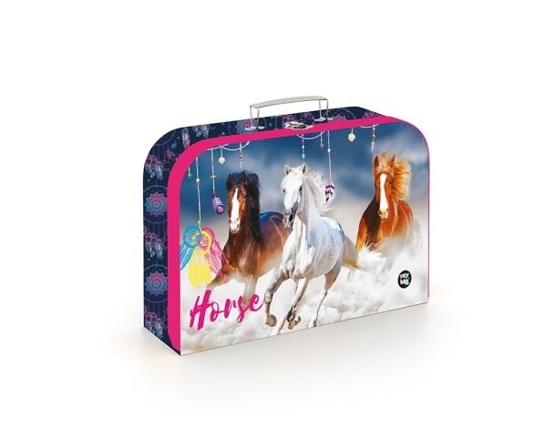 Lamino kufřík na výtvarnou výchovu. Do kufříku se vejde formát A4. Materiál: papír, lepenka, kovový zámeček, kovové nýty.