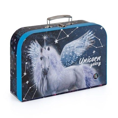 Lamino kufřík na výtvarnou výchovu. Do kufříku se vejde formát A4. Materiál: papír, lepenka, kovový zámeček, kovové nýty.