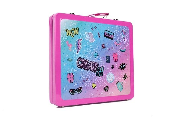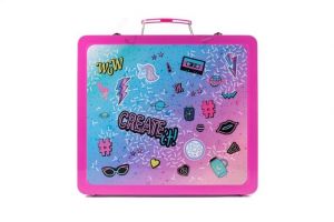 Make-up sada v luxusním kufříku – neon & třpytky. Obsahuje: 5× lak na nehty, pilník na nehty, aršík nálepek, 2× oddělovače prstů, paletka očních stínů s pěti barvami, lesk na rty, 2× balzám na rty, rtěnka a tvářenky se štětečkem.