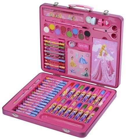 Kufřík malovací kovový Disney Princezny – obsahuje fixy, voskovky, pastelky, vodovky, obyčejné tužky, pravítko, gumu, ořezávátko, štětec, pravítko, bloček a nůžky.