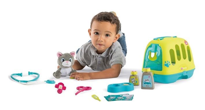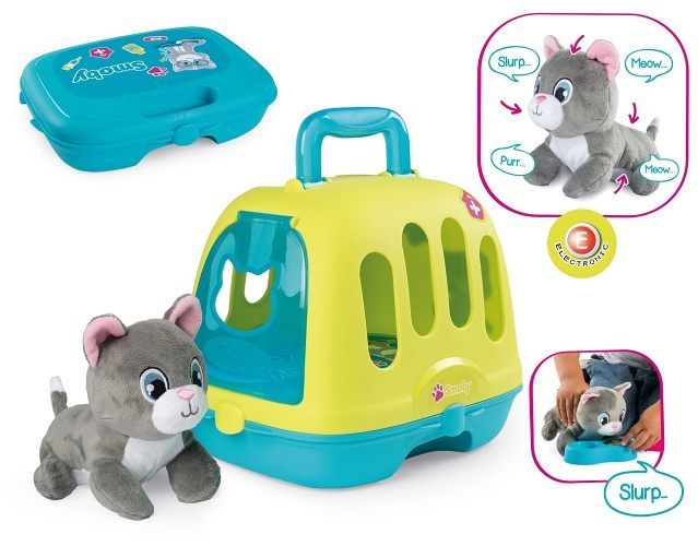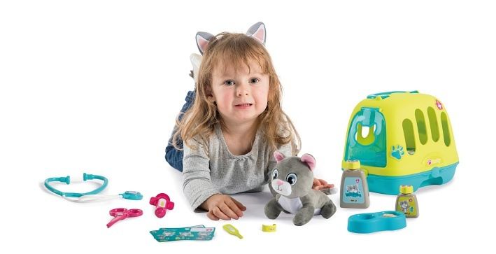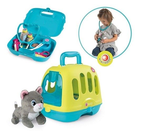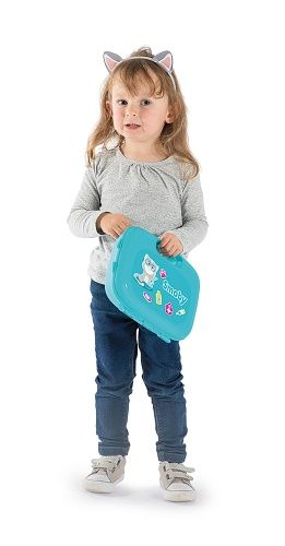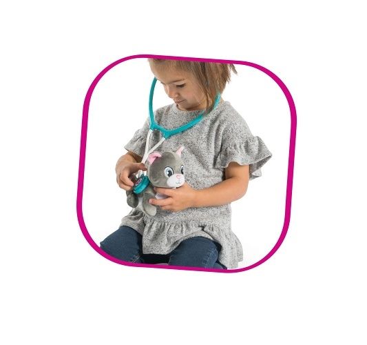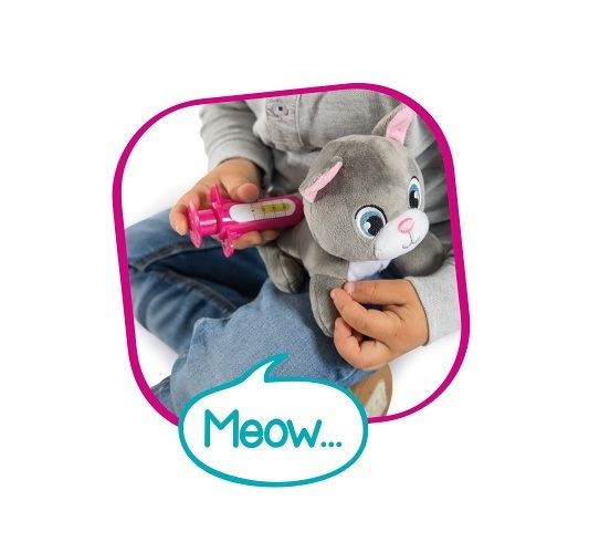 Praktický veterinářský kufřík, který je zároveň přepravním boxem. S měkkou plyšovou kočičkou se zvukovými efekty - když jí jemně zmáčkneš bříško, začne příst a mňoukat a když ji dáš najíst z její mističky uslyšíš jak si pochutnává. Bohaté příslušenství jako je stetoskop, injekce, teploměr, krmení pro kočičku atd.. Rozměry kufříku: 25,4 x 19,4 x 20,1 cm.