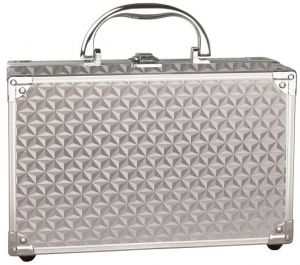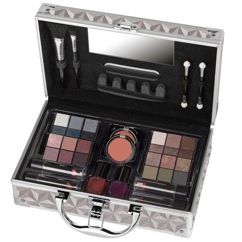 Kovový kosmetický kufřík obsahuje tvářenky, stíny, rtěnky, laky na nehty, aplikátory na stíhy, štětce, pilník na nehty a děliče na prsty.
