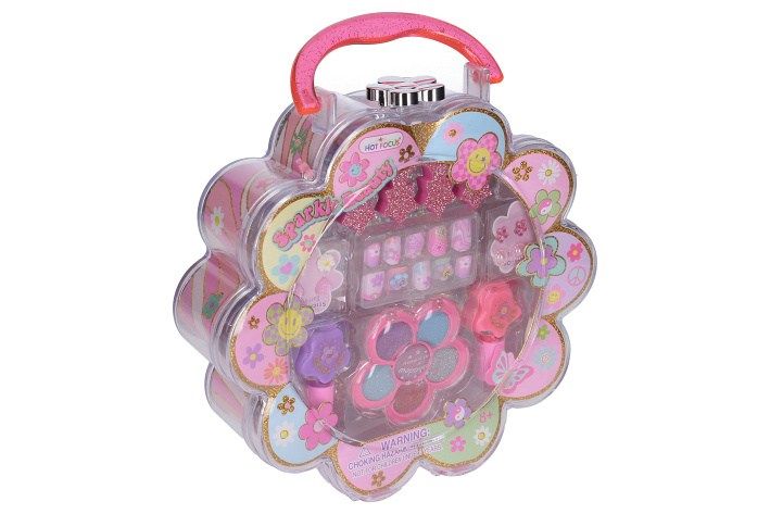 Kufřík s kosmetikou - kytička. Velikost 20cm. Obsahuje umělé nehty, laky na nehty, oční stíny, nalepovací náušnice, oddělovač prstů.