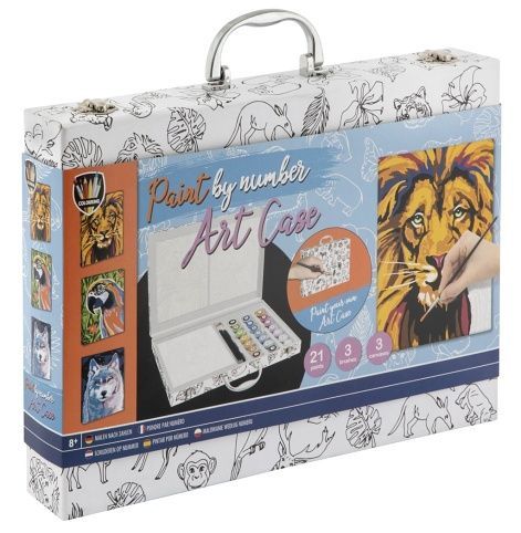 Kufřík s malováním podle čísel obsahuje předtištěné obrázky na plátně (3 ks – lev, papoušek a vlk) s čísly, 21 očíslovaných barev, 2 kulaté a 1 plochý štětec. Velikost kufříku 35×25 cm.