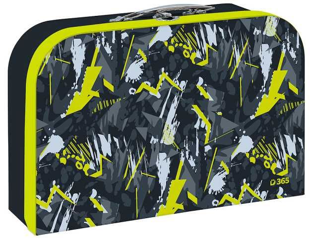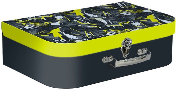 Vnější strana je pokryta potištěným papírem s dětskými motivy sladěnými se školními aktovkami a batohy. Rozměr: 35 x 22,5 x 10 cm