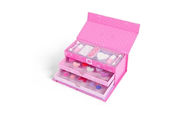 Kufřík třípatrový Beauty Create it! se zavíráním na magnet – obsahuje tři patra – první patro – 2× lak na nehty, pilník, 2× aplikátor, samolepky na nehty a tvářenku, druhé patro obsahuje – lesky na rty a třetí patro oční stíny a tvářenky.