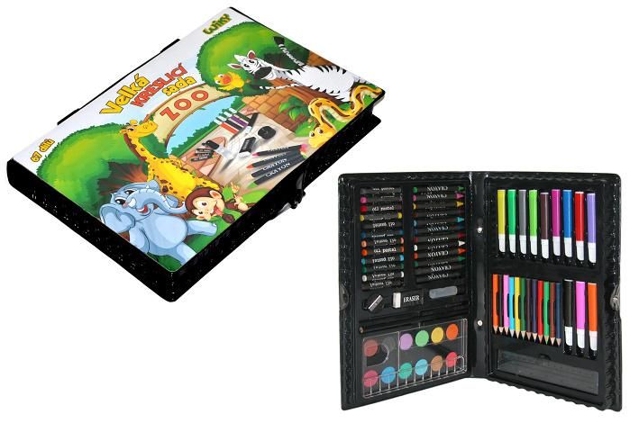 12 fixů, pastelek, voskovek a olejových pastelů, vodovky (12 odstínů), obyčejnou tužku, malířskou paletu, štětec, gumu, ořezávátko, pravítko, lepidlo na papír