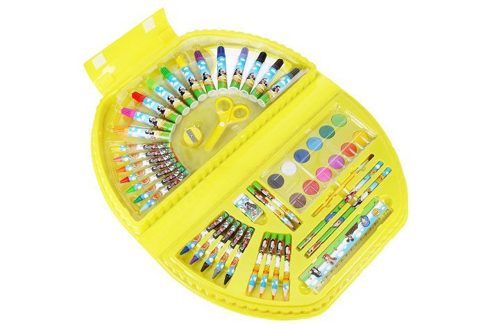 Obsahuje: 12 fixů, 12 voskových pastelů, 6 pastelek, 12 vodových barev, 1 pravítko, 2 tužky, 1 štětec, 1 guma, 1 strouhátko, 1 nůžky.