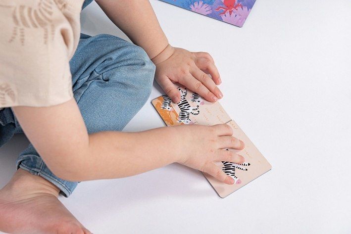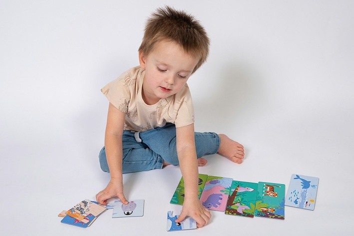 1. Při skládání puzzle navádíme nejmenší děti pomocí obrázků. Hledáme delfína, který je pod lodí. Tygr je vedle stromu. Atd