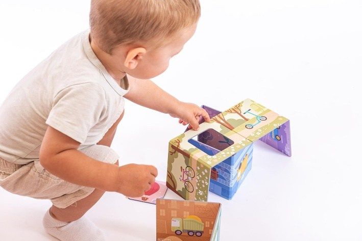 Tři oboustranná harmoniková leporela s okénky a čtvercovými vkládacími žetony. Na každém leporelu najdete čtyři vozidla vždy z jednoho tematického světa - staveniště, záchranáři, železnice atd. - celkem šest prostředí a 24 vozidel. Děti objevují nové možnosti, hrají si s výřezy a pohyblivými dílky. Díky různým kombinacím stránek vznikají nečekané průhledy a překvapení. Extra pevný 2 mm silný karton, rozměr každého leporela: 43,5 x 10,5 cm. Součástí balení jsou rady pro rodiče. Doporučený věk od 1–3 let. Vyrobeno v České republice ve spolupráci s pedagogy.