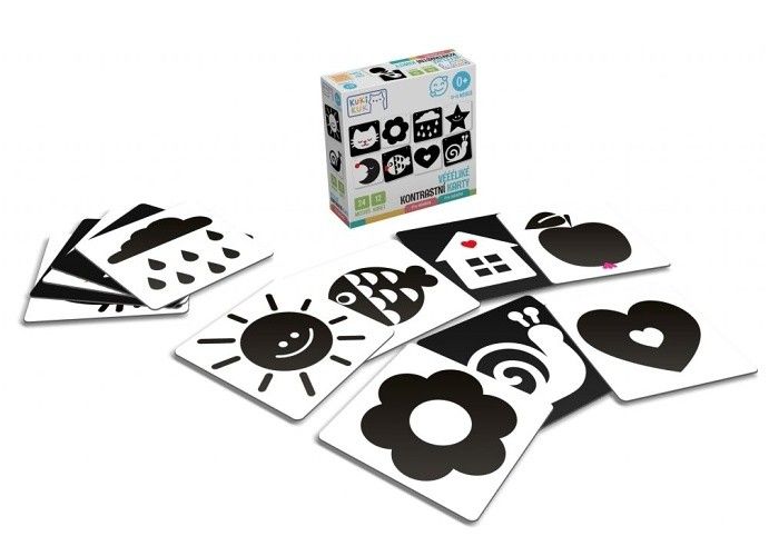 Sada 24 velkých kontrastních obrázků je ideální pro přirozený rozvoj zraku a pozornosti u miminek.