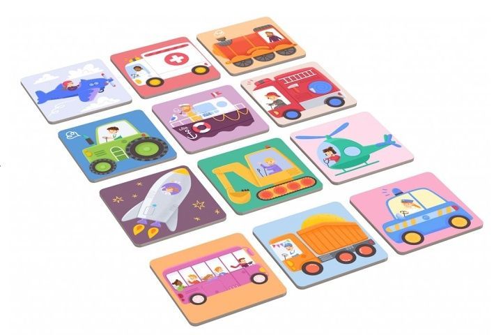 Vyberte si 6 různých kartiček ze sady a položte je lícem nahoru. Druhé kartičky z páru dejte dítěti. Požádejte jej, aby kartičky správně přiřadilo. Postupně rozšiřujte počet na 9 kartiček a pak na všech 12 kartiček. Při přiřazování kartiček do dvojic můžete postupně přidávat další úkoly. Jaké jsou druhy dopravy? Jak se nazývají dopravní prostředky? Jak se nazývá řidič? K jaké práci slouží? Atp.