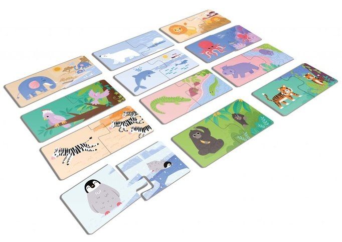 Puzzle DUO je vytvořeno tak, že linie spojovacích částí má takový tvar, aby šly spojit pouze správné obrázky, které patří k sobě. Zobrazují 12 různých zvířat v jejich přirozeném prostředí.