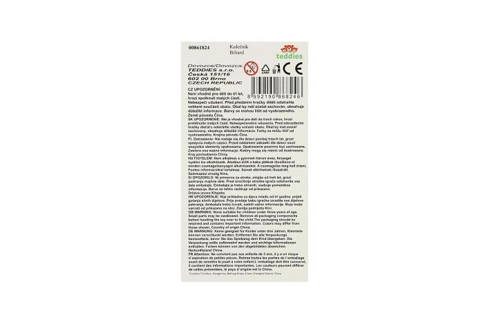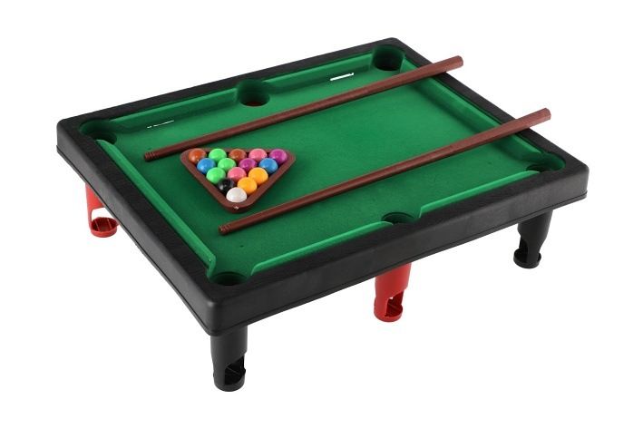 Dětský stolní kulečník je věrnou zmenšeninou klasického kulečníku. Stačí hru položit na stůl nebo jakoukoliv jinou rovnou plochu a hra může začít! Nechybí ani triangl pro srovnání koulí. Tento malý kulečníkový stůl je určen pro zábavu a trénuje motoriku a koordinaci rukou a očí. Velikost složeného kulečníku 33 x 26 x 10 cm.