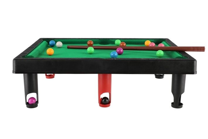 Dětský stolní kulečník je věrnou zmenšeninou klasického kulečníku. Stačí hru položit na stůl nebo jakoukoliv jinou rovnou plochu a hra může začít! Nechybí ani triangl pro srovnání koulí. Tento malý kulečníkový stůl je určen pro zábavu a trénuje motoriku a koordinaci rukou a očí. Velikost složeného kulečníku 33 x 26 x 10 cm.