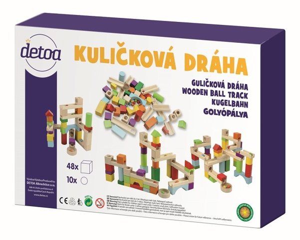 Dřevěná dráha se skládá z dřevěných dílků různých tvarů, barev a velikostí. Základní velikost krychle je 27 mm a O kuličky je 13 mm. Stavebnice rozvíjí motoriku rukou, kreativitu, fantazii a logické myšlení dětí. Výrobek splňuje požadavky EU na bezpečnost hraček.