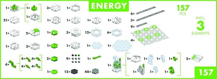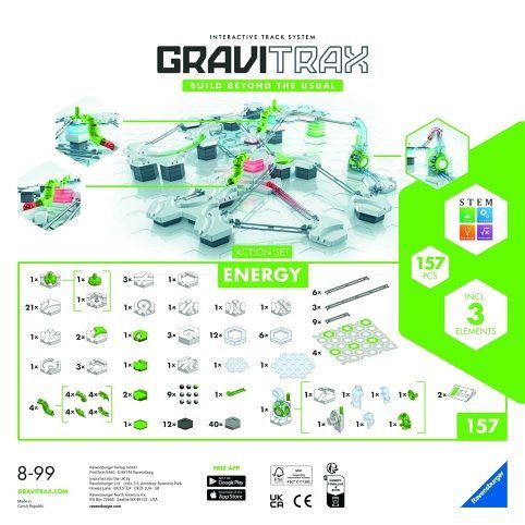 Neomezená zábava a akce díky nekonečným možnostem. Akční set Energy obsahuje vše pro stavbu kuličkových drah GraviTrax plných akce. Více než 150 akčních konstrukčních dílů dodají kuličkové dráze sílu a novou energii. Díky různým prvkům GraviTrax z akční setu Energy mohou kuličky projíždět různými úrovněmi dráhy a neustále nabírat rychlost. Kombinace řad CORE a POWER v tomto akčním setu Energy přináší jedinečné možnosti pro oživení vaší dráhy. Doplněk vertikální kanón dodává kuličkám novou energii a vynáší je směrem nahoru, zatímco Tubus je přepravuje zpět do nižších pater. Světelné moduly rozzáří každou dráhu GraviTrax! Sada pro hodiny zábavy a nekonečné možnosti. Kreativitě a zábavě se meze nekladou – pro odvážné stavitele, kteří si chtějí užít záludnou kuličkovou dráhu plnou variací! Vertikální akce a barevné světelné efekty vytvářejí nekonečnou stavební zábavu a neomezenou kreativitu. Poznejte fyzikální zákony formou hry. Na baterie: 9x AAA (nejsou součástí balení)