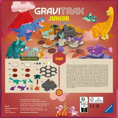 GraviTrax Junior je interaktivní systém kuličkové dráhy pro děti od 3 let. Ti nejmenší si staví své vlastní světy z kuličkových drah, které lze podle libosti zdobit a vytvářet tak jednotlivé tematické světy. Děti si tak při kreativním stavění užijí mnoho zábavy. Ve spojení se startovací sadou se děti od 3 let mohou okamžitě ponořit do světa dinosaurů. Různorodé dinosauří figurky, působivá sopka a další tematické prvky poskytují nekonečné možnosti stavění a hraní. Všechny součásti jsou vyrobeny z dřevěného bioplastu.