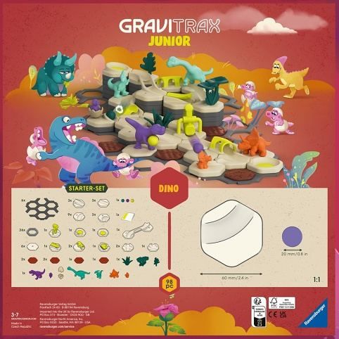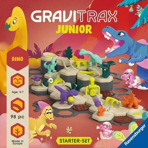 GraviTrax Junior nabízí dětem od 3 let hravý vstup do světa tematických kuličkových drah. Se startovací sadou GraviTrax Junior L Dino se mohou děti od 3 let ponořit do světa dinosaurů. Sada obsahuje vše potřebné pro okamžité stavění a hraní. S různými dinosauřími figurkami a prvky z dinosauřího světa si děti mohou dinosauří svět prozkoumat zblízka. Napínavé komponenty, jako jsou tunelové zatáčky, výhybka, 3-v-1 zatáčka a křižovatky, dělají stavění ještě zábavnější. Všechny součásti jsou vyrobeny z dřevěného bioplastu.