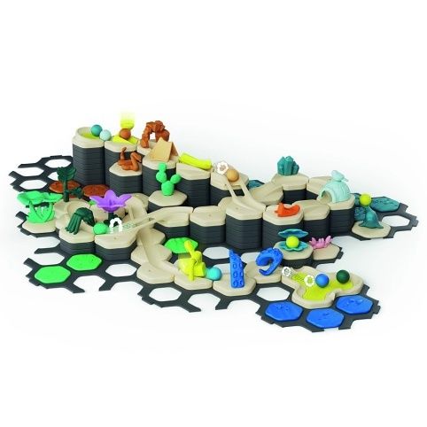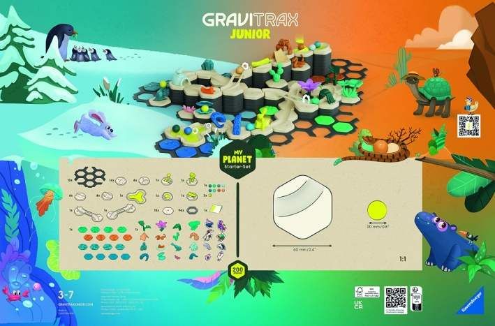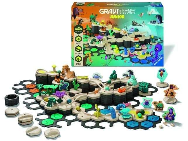 GraviTrax Junior je interaktivní systém kuličkové dráhy pro děti od 3 let. Ti nejmenší si staví své vlastní světy z kuličkových drah, které lze podle libosti zdobit a vytvářet tak jednotlivé tematické světy. Děti si tak při kreativním stavění užijí mnoho zábavy. GraviTrax Junior Startovní sada Můj svět obsahuje vše, co potřebujete, abyste mohli ihned začít stavět a ponořit se do tematických světů džungle, ledu, pouště a oceánu. S různými dekoračními prvky a figurkami zvířat a rostlin vyrobených z dřevěného bioplastu mohou děti od 3 let zažít zblízka 4 tematické světy, které si mohou při hře libovolně vyzdobit. Tato XXL tematická startovní sada obsahuje 200 dílků včetně doplňků Houpačka a Kladivo, čímž nabízí neomezenou zábavu pro všechny malé fanoušky GraviTraxu. Děti si při kreativním stavění užijí mnoho zábavy.