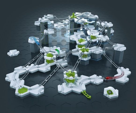 Se startovní sadou GraviTrax PRO Extreme obsahující 191 stavebních prvků můžete dosáhnout čím dál větších výšek. Tato speciální startovní sada nejenže umožňuje budovat vaši stavbu do výšky, ale také obsahuje Magnetický kanón a všechny malé doplňky z řady GraviTrax PRO – Splitter, Mixér, Točnu a Šroubovici. S 6 kuličkami, které na vás v sadě čekají, můžete již ze startovního kamene budovat více tras najednou a vsadit se, která kulička bude v cílí první. Speciální stěny, balkonové závěsy a výškové stavební kameny zvednou vaši dráhu rovnou o několik pater výš a dráhy můžete vést i skrze ně.